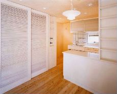 左のルーバー戸は書斎となっています。ひとつの空間の中で様々な暮らしに対応しながら家族のつながりを考えた構成としています。戸を開け放してひとつの空間の延長として使うもよし、閉めてセミプライベートに使うもよし、その時そのときの各自のポジションで家族の誰もが都合によって使い分けるというコンセプトです。 |